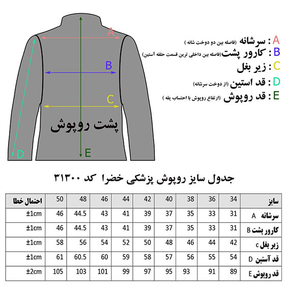 سایز بندی34 / 36 / 38 / 40 / 42 / 44 / 46 / 48 / 50 / 52مدلزنانه و مردانهجنسپارچه ترگال بدون آبرفت و تغییر سایزآپشننیم یقه و دارای جیب های کنار روپوش