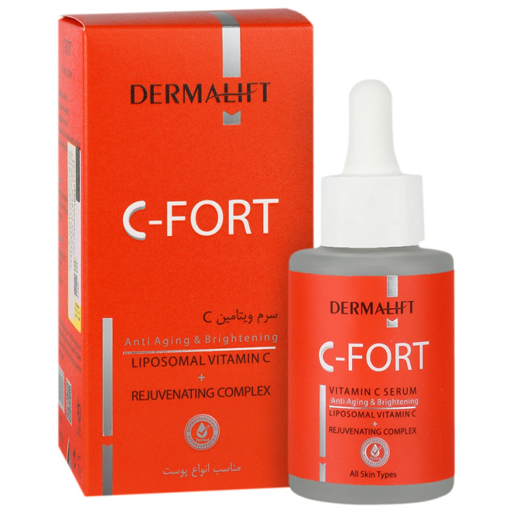 این ویتامین یک آنتی اکسیدان قوی محسوب گردیده و پوست را در برابر رادیکال های آزاد و عواملی که باعث پیری و تیرگی پوست می شوند، محافظت می نماید. در سرم سی فورت از نوع لیپوزومال ویتامین سی استفاده گردیده است که علاوه بر پایدار بودن ساختار مولکولی، دارای قدرت نفوذ فوق العاده به داخل پوست می باشد. ویتامین سی با تقویت ساخت رشته های کلاژن و الاستین، باعث افزایش استحکام و خاصیت الاستیسیته پوست می گردد و بعنوان یک جوان کننده قوی باعث رفع چین و چروک های سطحی و عمیق پوست می گردد. این ماده همچنین با مهار آنزیم تیروزیناز در رفع لک ها و تیرگی های پوست خصوصا لک های ناشی از افزایش سن بسیار موثر می باشد.